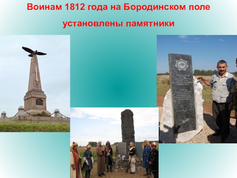 Слайд 26Воинам 1812 года на Бородинском поле установлены памятники