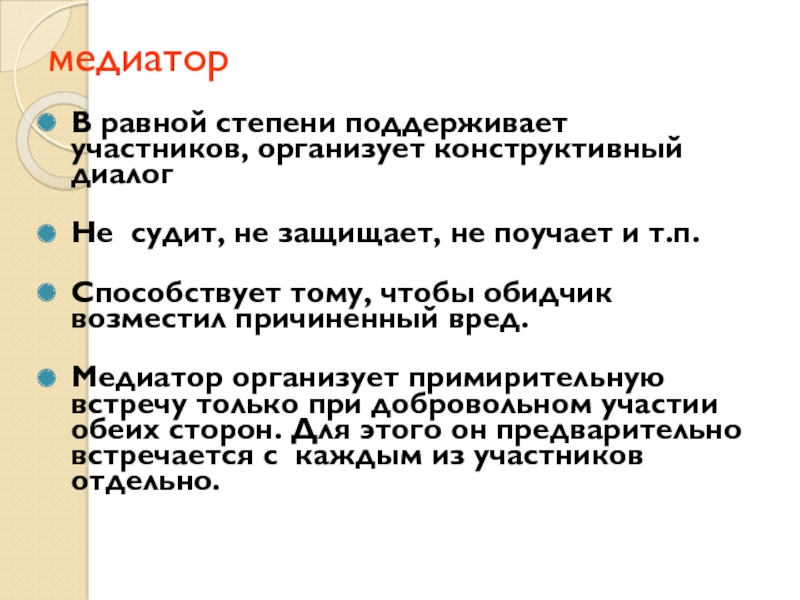 Принцип нейтральности (медиатор не поддерживает ни одну из сторон, помогает наладить конструктивный диалог между сторонами по поводу возможного разрешения ситуации, является независимым посредником, равноправное отношение к участникам конфликта)