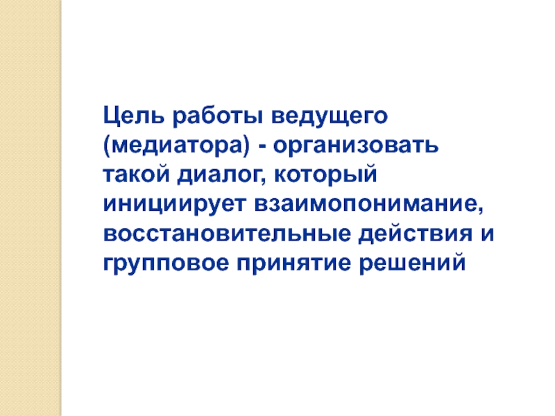 Слайд 34Цель работы ведущего (медиатора) - организовать такой диалог, который инициирует взаимопонимание,