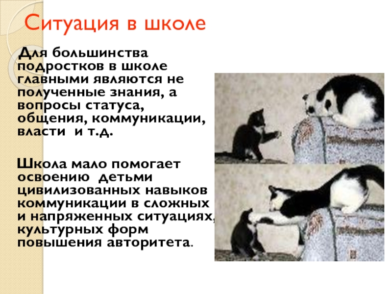 Школа мало помогает освоению детьми цивилизованных навыков коммуникации в сложных и напряженных ситуациях, культурных форм повышения авторитета.