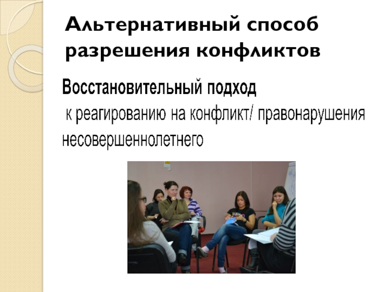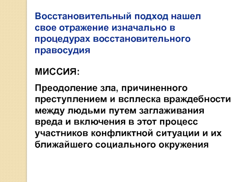 Слайд 25Восстановительный подход нашел свое отражение изначально в процедурах восстановительного правосудия