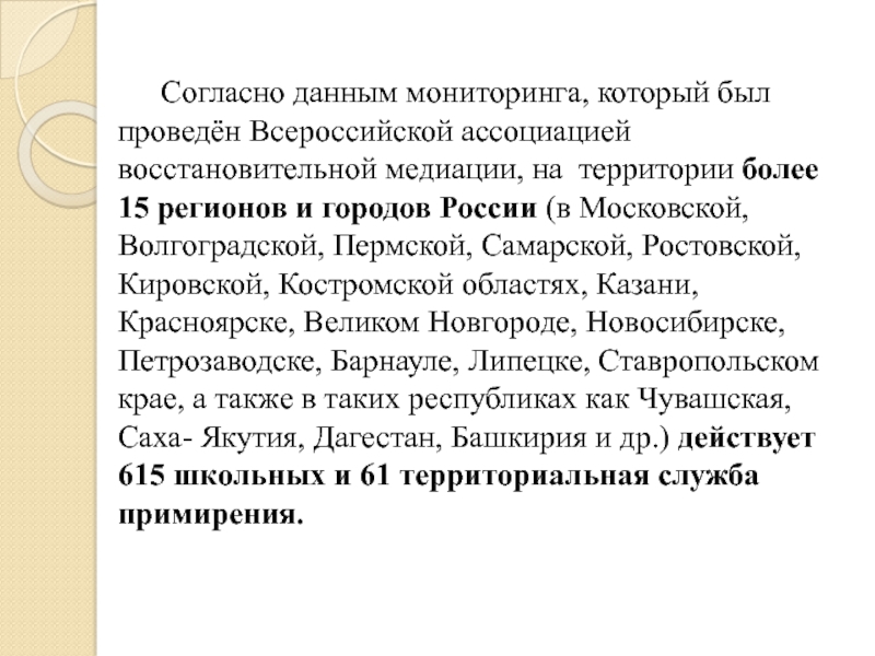 Слайд 48Согласно данным мониторинга, который был проведён Всероссийской ассоциацией восстановительной медиации, на