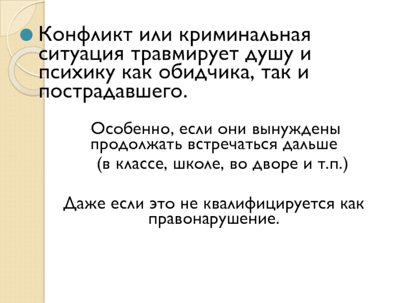 Слайд 13Конфликт или криминальная ситуация травмирует душу и психику как обидчика, так