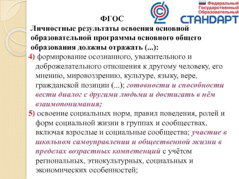 4) формирование осознанного, уважительного и доброжелательного отношения к другому человеку, его мнению, мировоззрению, культуре, языку, вере, гражданской позиции (...); готовности и способности вести диалог с другими людьми и достигать в нём взаимопонимания;