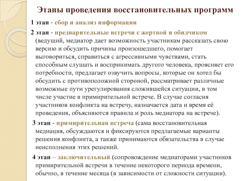 3 этап - примирительная встреча (сама восстановительная медиация, обсуждаются и фиксируются предлагаемые варианты решения конфликта, а также принимаются обязательства в случае неисполнения этих решений.
