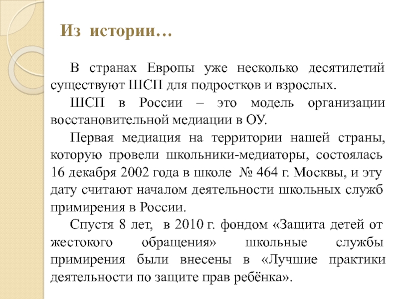Первая медиация на территории нашей страны, которую провели школьники-медиаторы, состоялась 16 декабря 2002 года в школе № 464 г. Москвы, и эту дату считают началом деятельности школьных служб примирения в России.