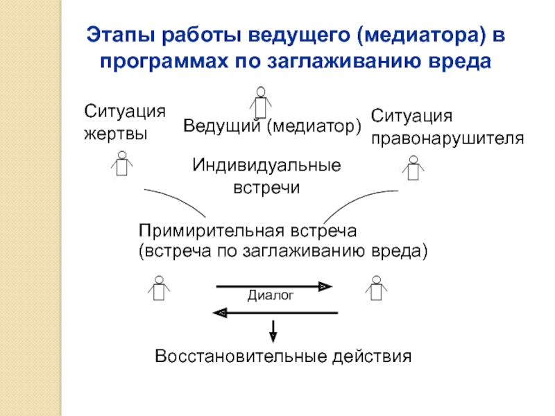 Слайд 35Этапы работы ведущего (медиатора) в программах по заглаживанию вреда