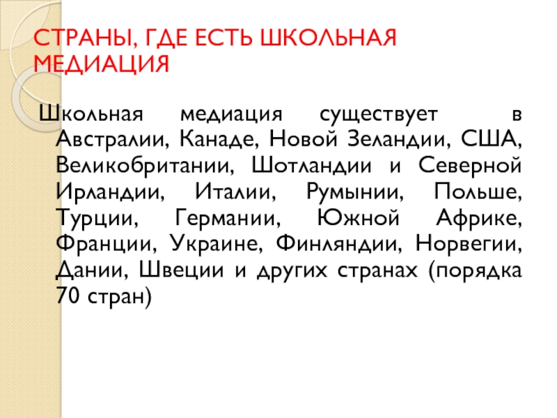 Слайд 47СТРАНЫ, ГДЕ ЕСТЬ ШКОЛЬНАЯ МЕДИАЦИЯ