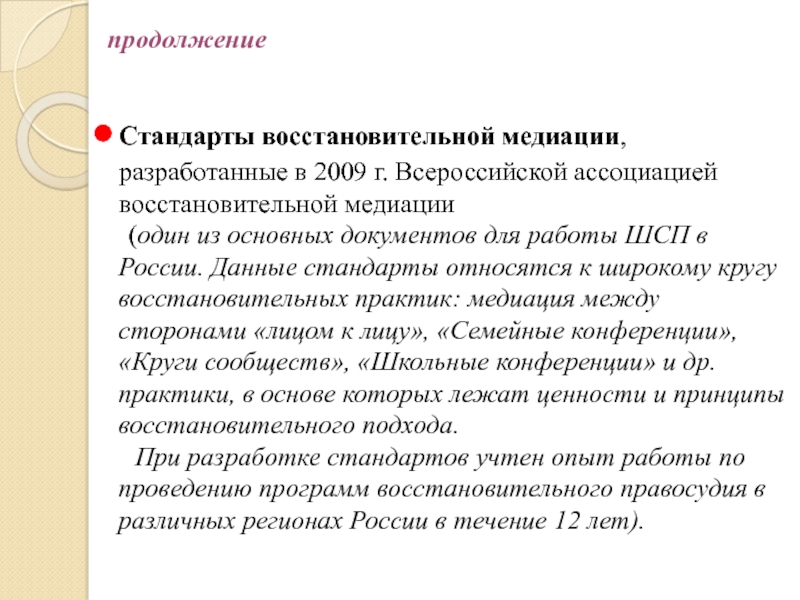 Слайд 6Стандарты восстановительной медиации, разработанные в 2009 г. Всероссийской ассоциацией восстановительной медиации