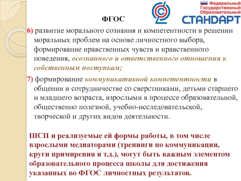ШСП и реализуемые ей формы работы, в том числе взрослыми медиаторами (тренинги по коммуникации, круги примирения и т.д.), могут быть важным элементом образовательного процесса школы для достижения указанных во ФГОС личностных результатов.