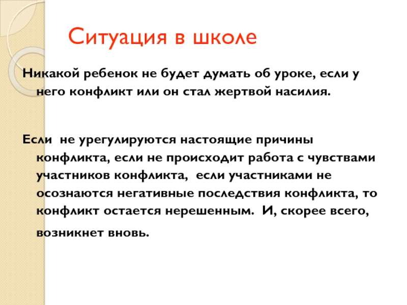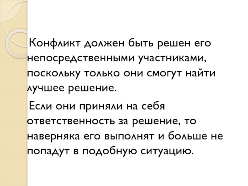 Если не урегулируются настоящие причины конфликта, если не происходит работа с чувствами участников конфликта, если участниками не осознаются негативные последствия конфликта, то конфликт остается нерешенным. И, скорее всего, возникнет вновь.
