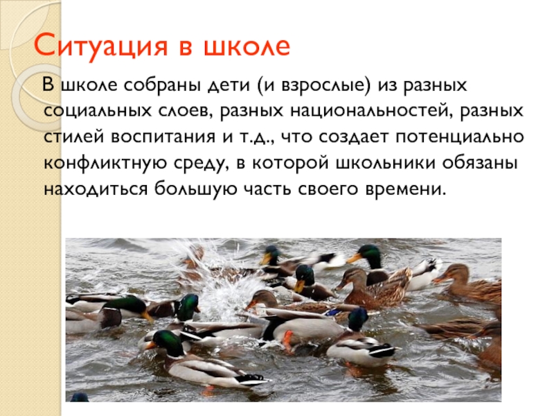 разных социальных слоев, разных национальностей, разных стилей воспитания и т.д., что создает потенциально конфликтную среду, в которой школьники обязаны находиться большую часть своего времени.