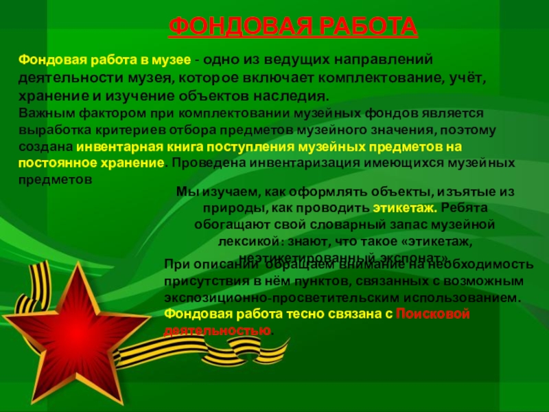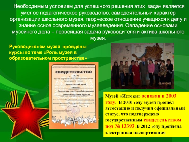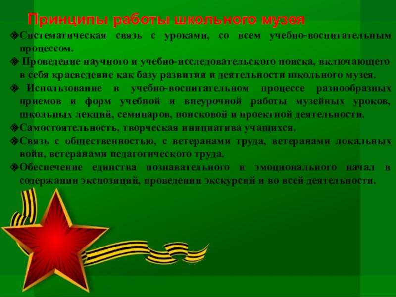 руководство, самодеятельный характер организации школьного музея, творческое отношение учащихся к делу и знание основ современного музееведения. Овладение основами музейного дела – первейшая задача руководителя и актива школьного музея.