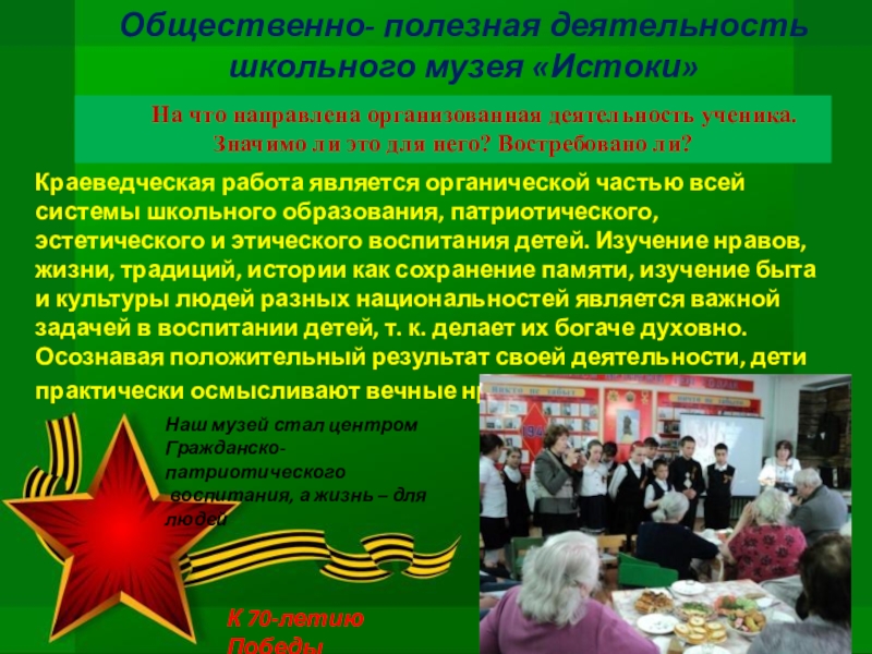 Музей - это условие для личностного роста, которое помогает реализовывать собственные способности и склонности. Школьный музей обладает практически неограниченным потенциалом воспитательного воздействия на умы и души подростков. Участие в поисковой работе, встречи с интересными людьми, знакомство с историческими фактами помогают учащимся узнать историю и проблемы родного края изнутри, понять, как много сил и души вложили их предки в экономику и культуру родного края.