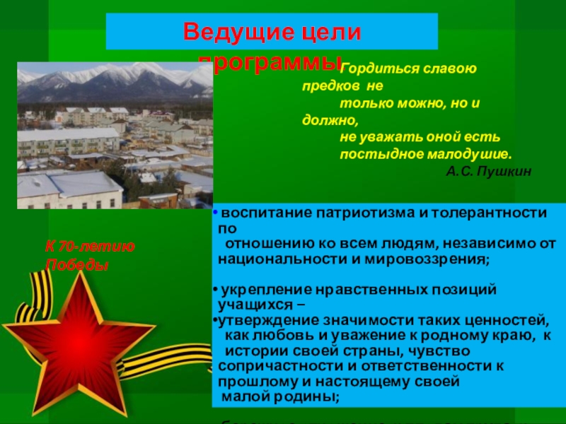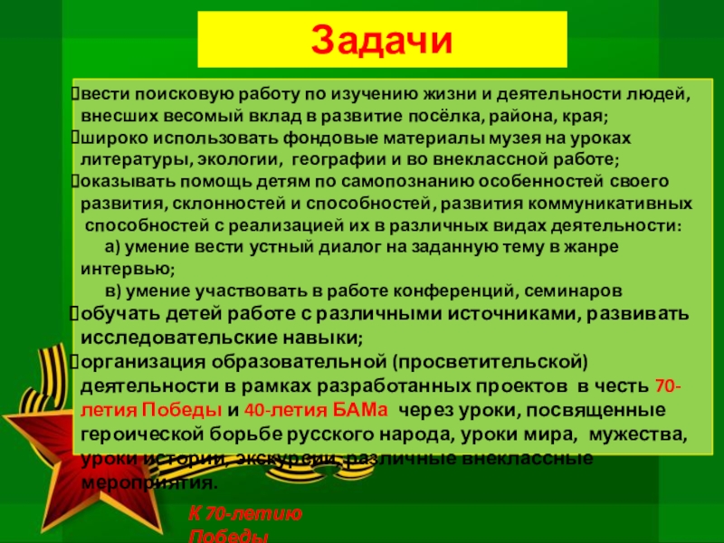 организация образовательной (просветительской) деятельности в рамках разработанных проектов в честь 70-летия Победы и 40-летия БАМа через уроки, посвященные героической борьбе русского народа, уроки мира, мужества, уроки истории, экскурсии, различные внеклассные мероприятия.