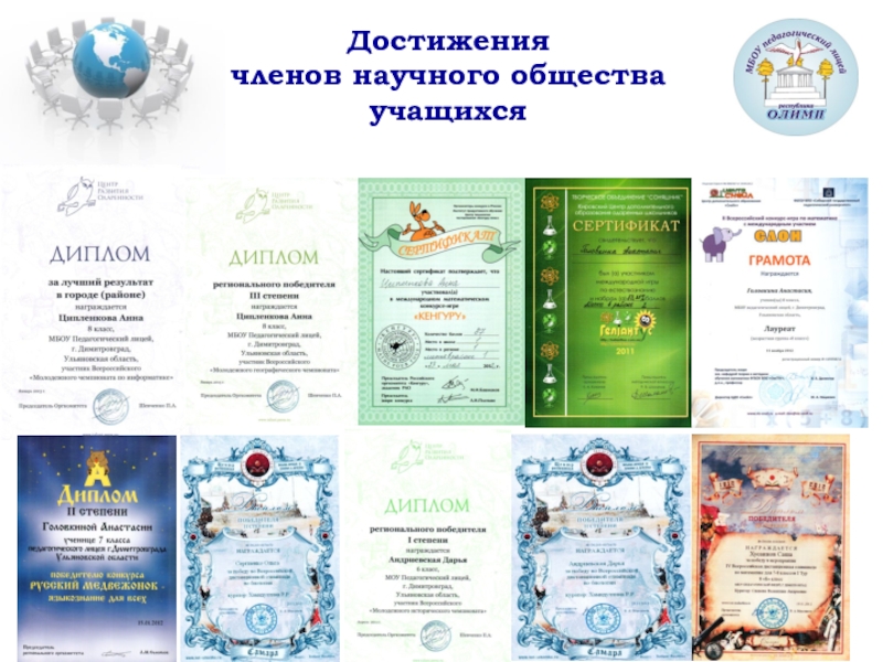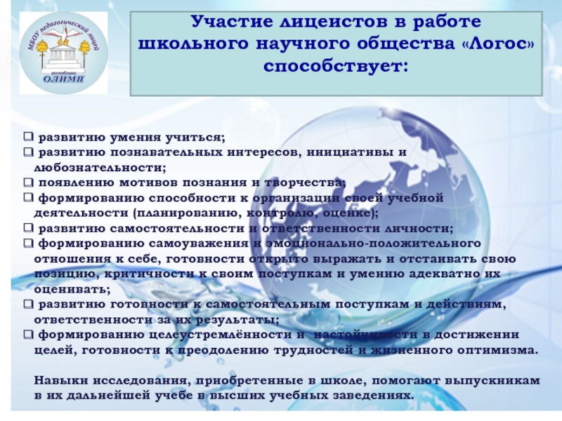 Участие лицеистов в работе школьного научного общества «Логос» способствует: