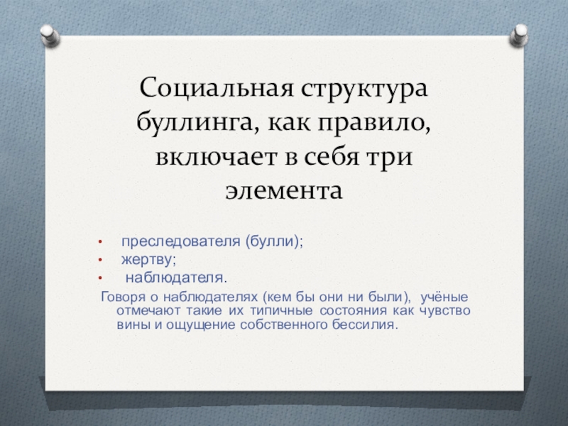 Слайд 11Социальная структура буллинга, как правило, включает в себя три элемента