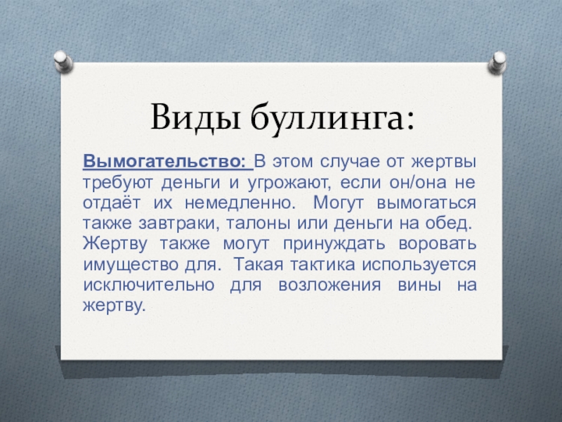 если он/она не отдаёт их немедленно. Могут вымогаться также завтраки, талоны или деньги на обед. Жертву также могут принуждать воровать имущество для. Такая тактика используется исключительно для возложения вины на жертву.