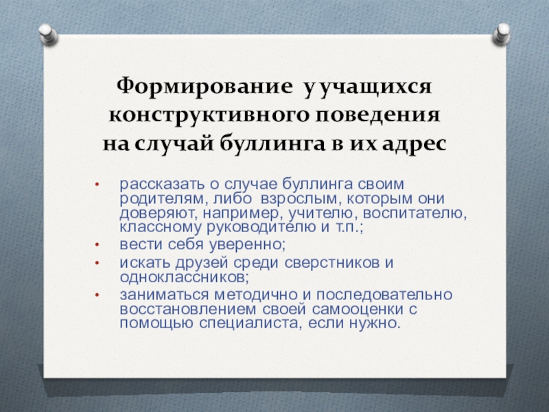 Слайд 17Формирование у учащихся конструктивного поведения на случай буллинга в их адрес