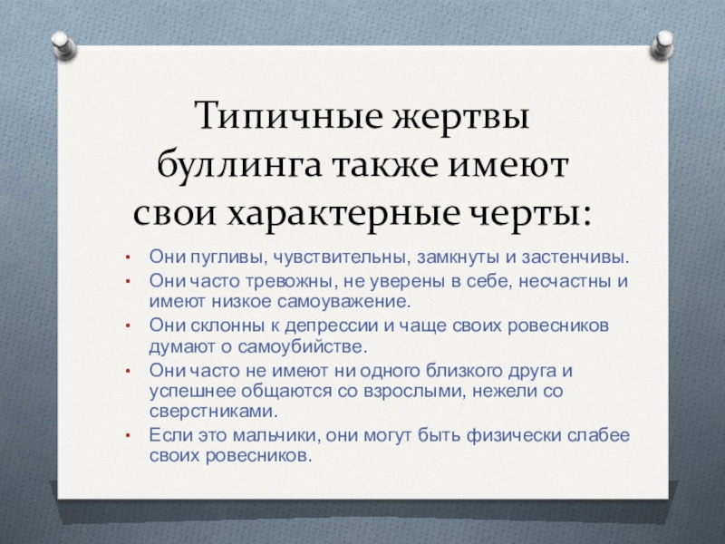 Слайд 13Типичные жертвы буллинга также имеют свои характерные черты: