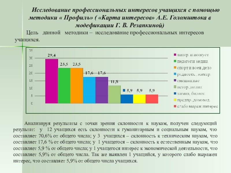 Анализируя результаты с точки зрения склонности к наукам, получен следующий результат: у 12 учащихся есть склонности к гуманитарным и социальным наукам, что составляет 70,6% от общего числа; у 3 учащихся – склонность к техническим наукам, что составляет 17,6 % от общего числа; у 1 учащегося – склонность к естественным наукам, что составляет 5,9 % от общего числа; у 1 учащегося интерес к экономической деятельности, что составляет 5,9% от общего числа. Так же выявлен 1 учащийся, у которого слабо выражен интерес, что составляет 5,9% от общего числа учащихся.