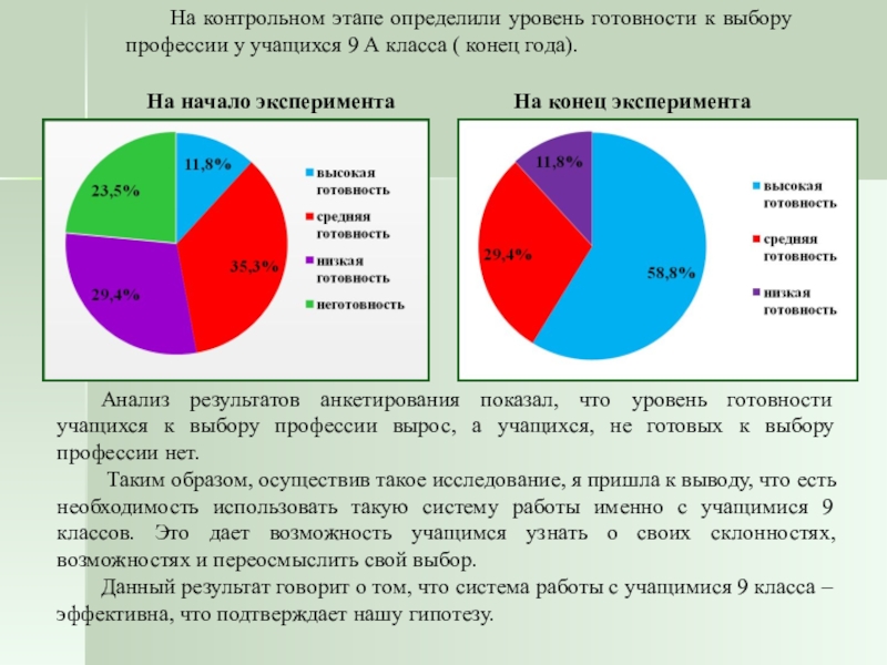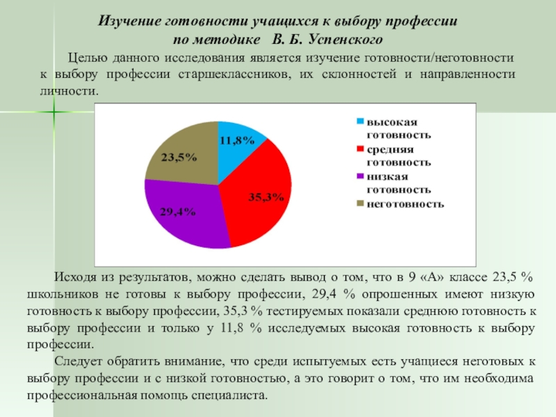 Исходя из результатов, можно сделать вывод о том, что в 9 «А» классе 23,5 % школьников не готовы к выбору профессии, 29,4 % опрошенных имеют низкую готовность к выбору профессии, 35,3 % тестируемых показали среднюю готовность к выбору профессии и только у 11,8 % исследуемых высокая готовность к выбору профессии.