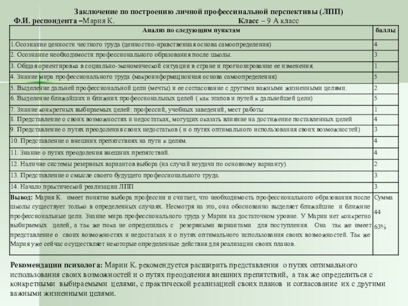 Рекомендации психолога: Марии К. рекомендуется расширить представления о путях оптимального использования своих возможностей и о путях преодоления внешних препятствий, а так же определиться с конкретными выбираемыми целями, с практической реализацией своих планов и согласование их с другими важными жизненными целями.