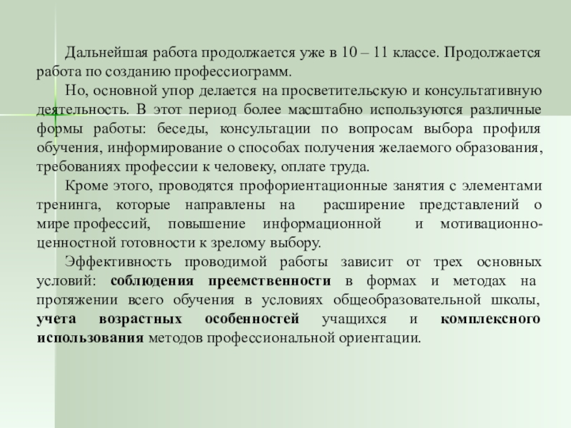 4 этап – 10-11 классы. В этот период более масштабно используются различные формы работы: беседы, консультации по вопросам выбора профиля обучения, информирование о способах получения желаемого образования, требованиях профессии к человеку, оплате труда. Продолжается работа по созданию профессиограмм, в которых отражены психофизические особенности профессий.
