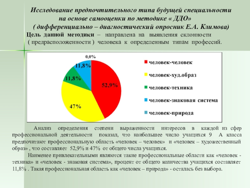 Анализ определения степени выраженности интересов в каждой из сфер профессиональной деятельности показал, что наибольшее число учащихся 9 А класса предпочитают профессиональную область «человек – человек» и «человек – художественный образ» , что составляет 52,9% и 47% от общего числа учащихся.