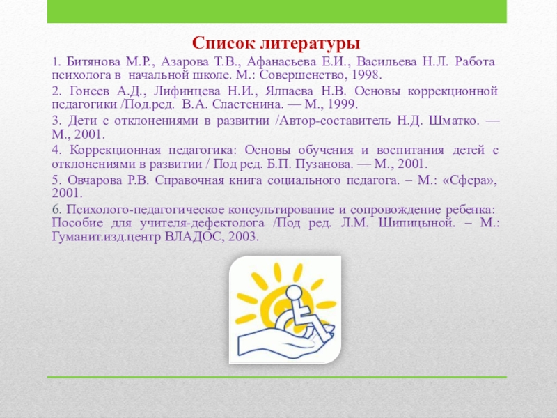 2. Гонеев А.Д., Лифинцева Н.И., Ялпаева Н.В. Основы коррекционной педагогики /Под.ред. В.А. Сластенина. — М., 1999.