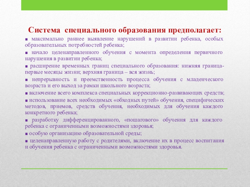■ расширение временных границ специального образования: нижняя граница- первые месяцы жизни; верхняя граница – вся жизнь;
