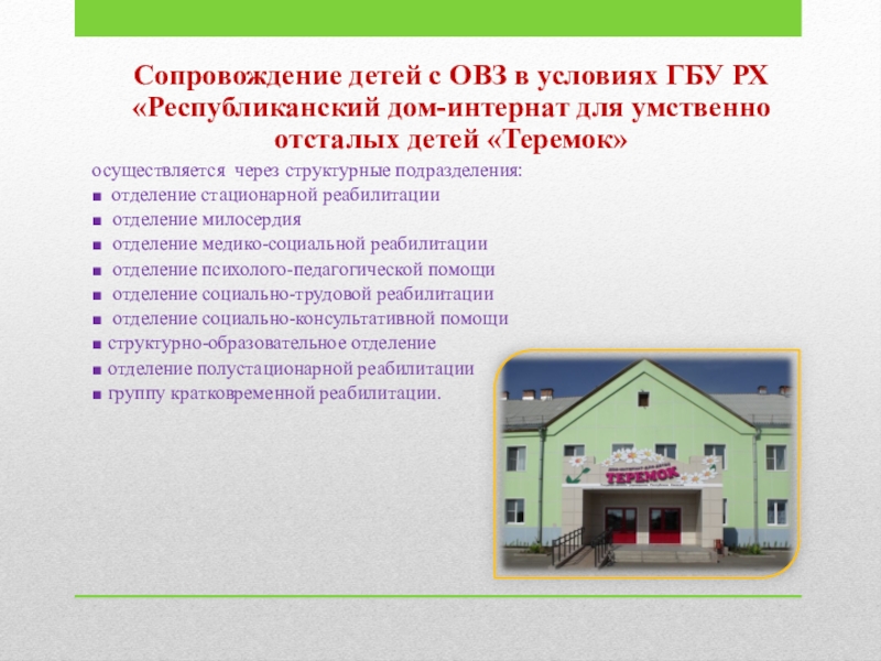 Слайд 15Сопровождение детей с ОВЗ в условиях ГБУ РХ «Республиканский дом-интернат для
