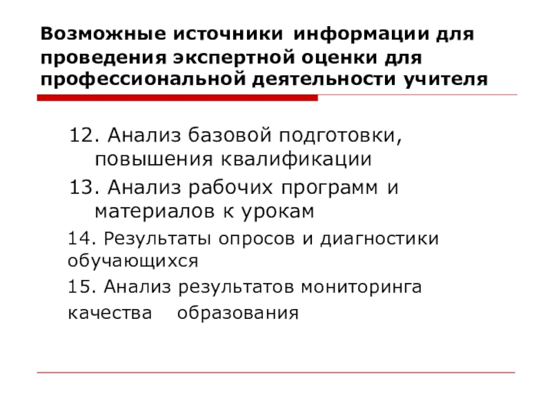 Слайд 12Возможные источники информации для проведения экспертной оценки для профессиональной деятельности учителя