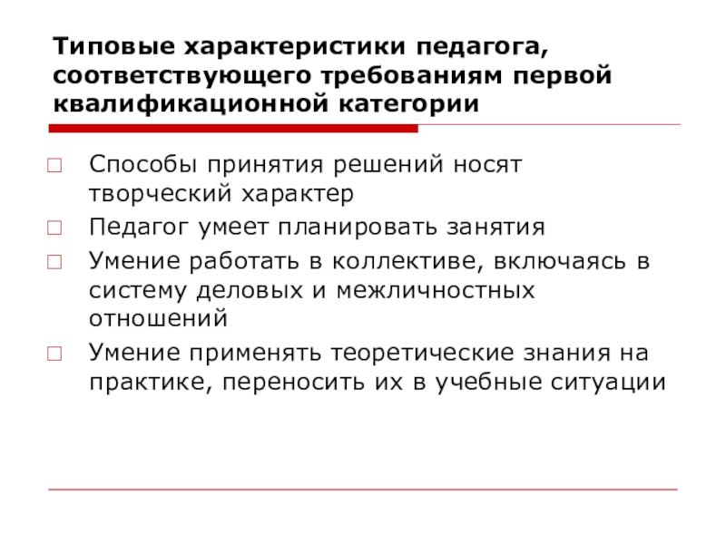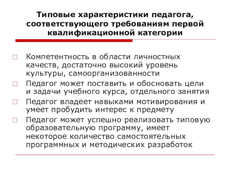 Слайд 15Типовые характеристики педагога, соответствующего требованиям первой квалификационной категории