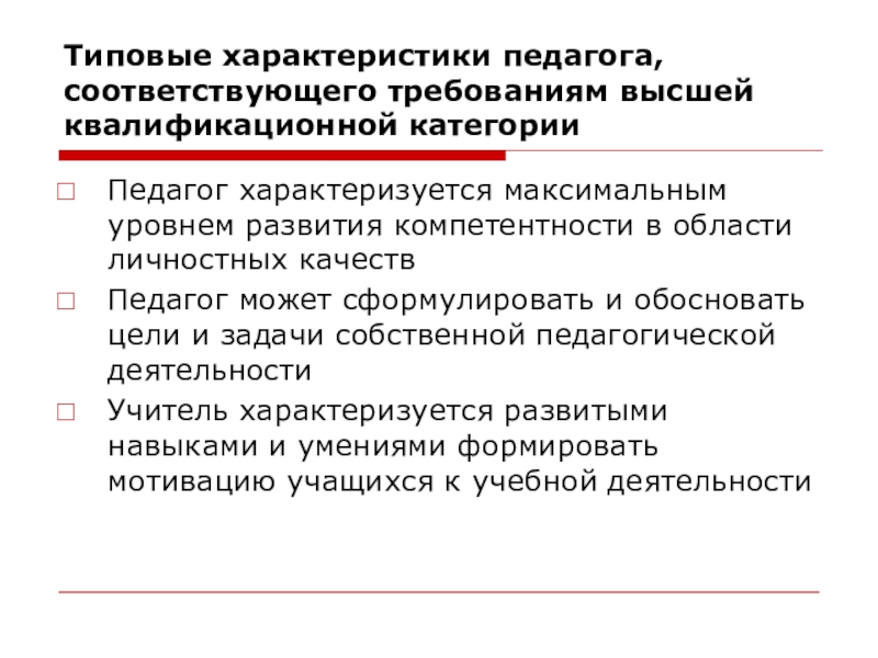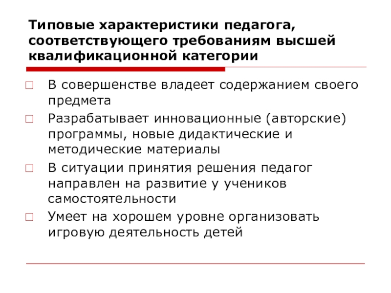 Слайд 16Типовые характеристики педагога, соответствующего требованиям высшей квалификационной категории
