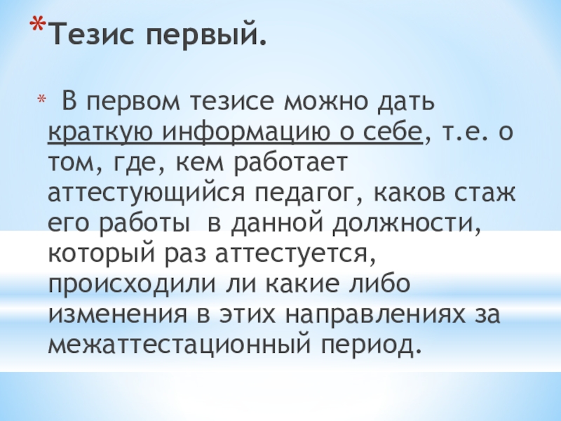 В первом тезисе можно дать краткую информацию о себе, т.е.