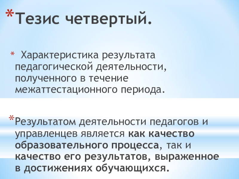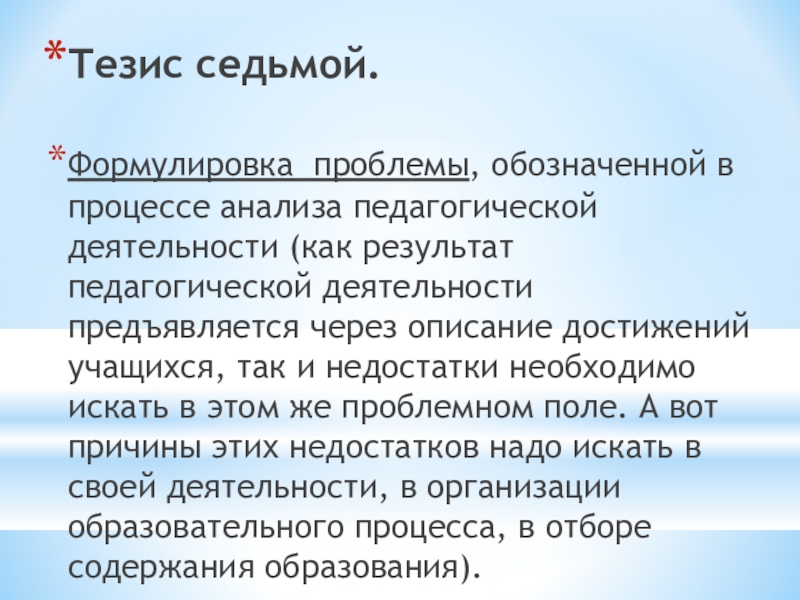 педагогической деятельности предъявляется через описание достижений учащихся, так и недостатки необходимо искать в этом же проблемном поле. А вот причины этих недостатков надо искать в своей деятельности, в организации образовательного процесса, в отборе содержания образования).