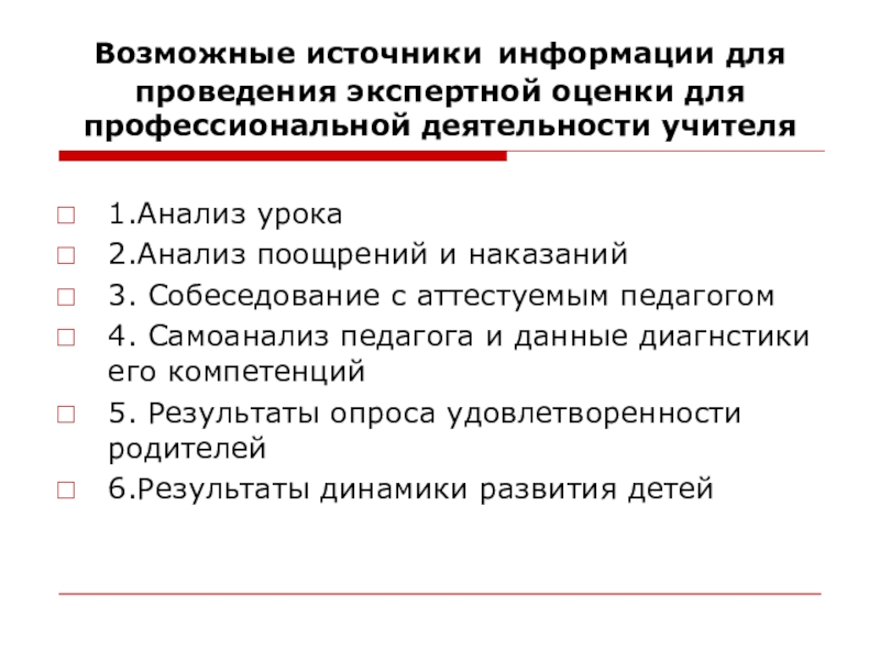 Слайд 13Возможные источники информации для проведения экспертной оценки для профессиональной деятельности учителя