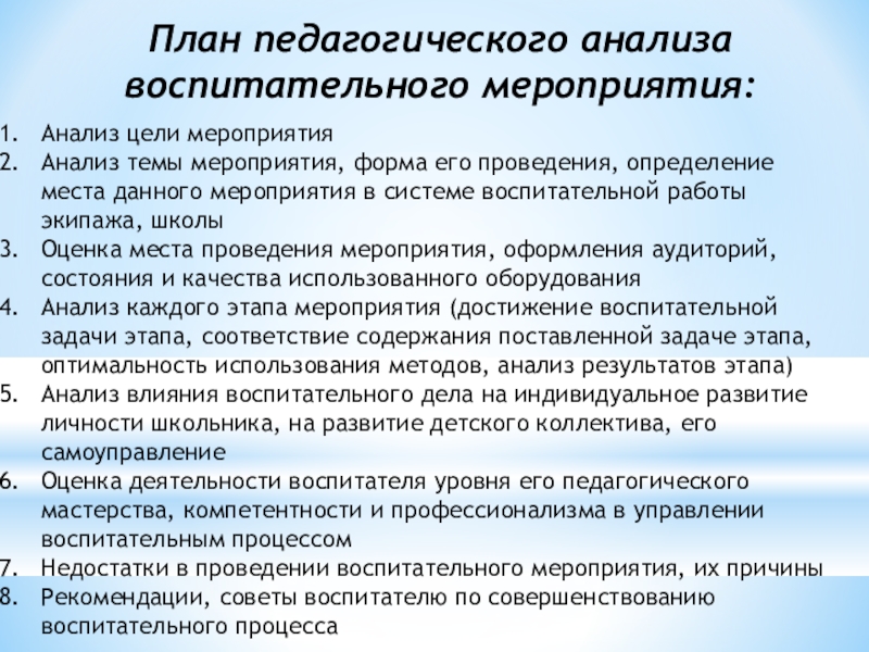 Слайд 40План педагогического анализа воспитательного мероприятия: