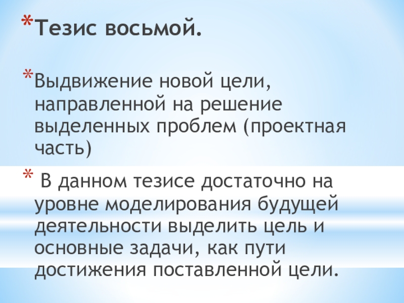 В данном тезисе достаточно на уровне моделирования будущей деятельности выделить цель и основные задачи, как пути достижения поставленной цели.