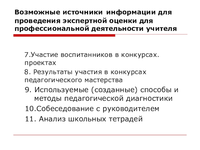 Слайд 11Возможные источники информации для проведения экспертной оценки для профессиональной деятельности учителя
