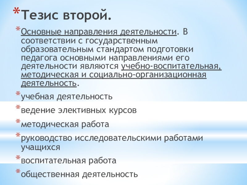 педагога основными направлениями его деятельности являются учебно-воспитательная, методическая и социально-организационная деятельность.