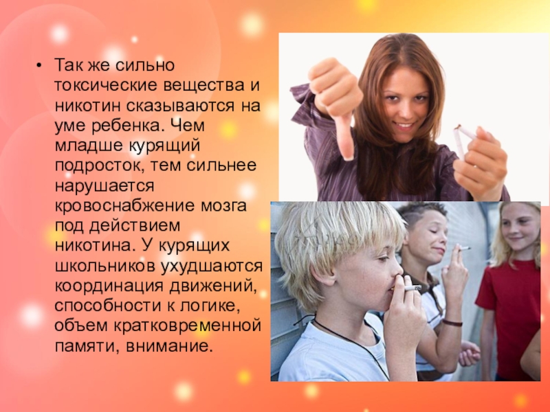Так же сильно токсические вещества и никотин сказываются на уме ребенка. Чем младше курящий подросток, тем сильнее