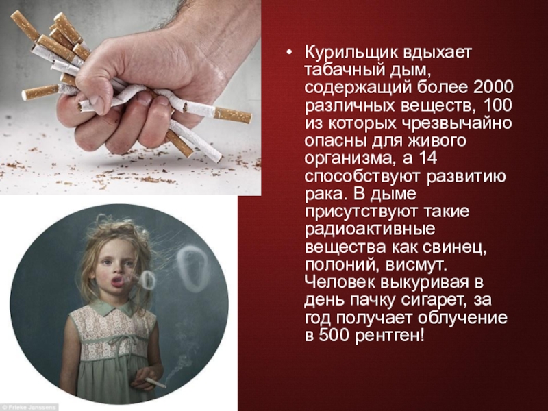 которых чрезвычайно опасны для живого организма, а 14 способствуют развитию рака. В дыме присутствуют такие радиоактивные вещества как свинец, полоний, висмут. Человек выкуривая в день пачку сигарет, за год получает облучение в 500 рентген!