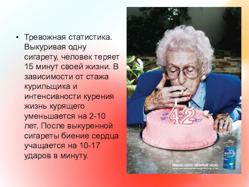 В зависимости от стажа курильщика и интенсивности курения жизнь курящего уменьшается на 2-10 лет. После выкуренной сигареты биение сердца учащается на 10-17 ударов в минуту.