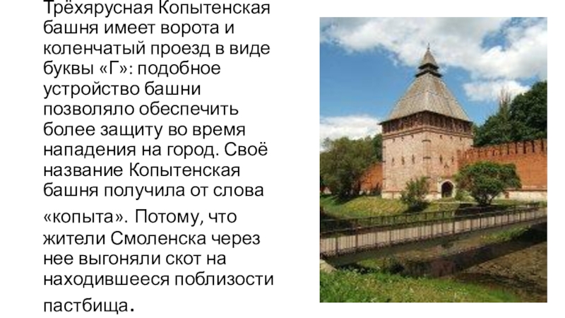 Слайд 4Копытенская башня – одна из проезжих башен Смоленской крепостной стены. Находится