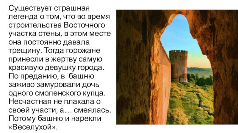 Слайд 8Веселуха – это 16-гранная башня Смоленской крепостной стены, расположенная на вершине