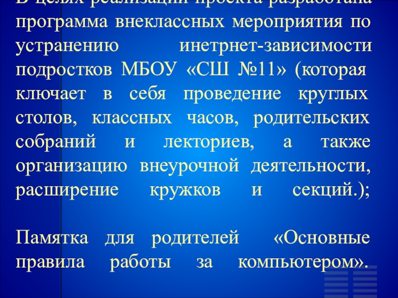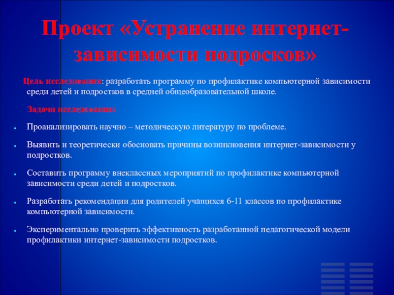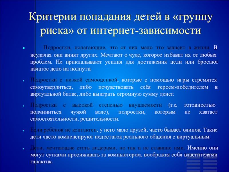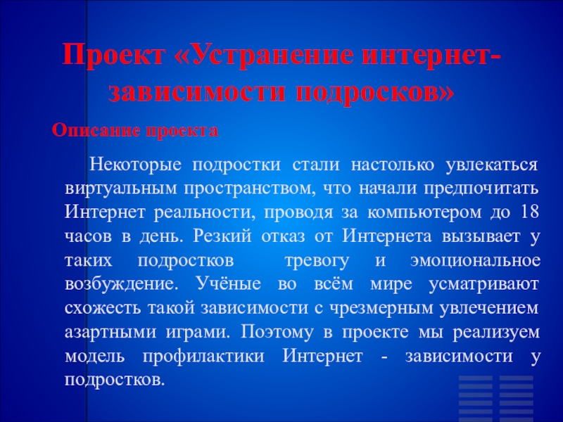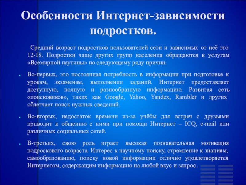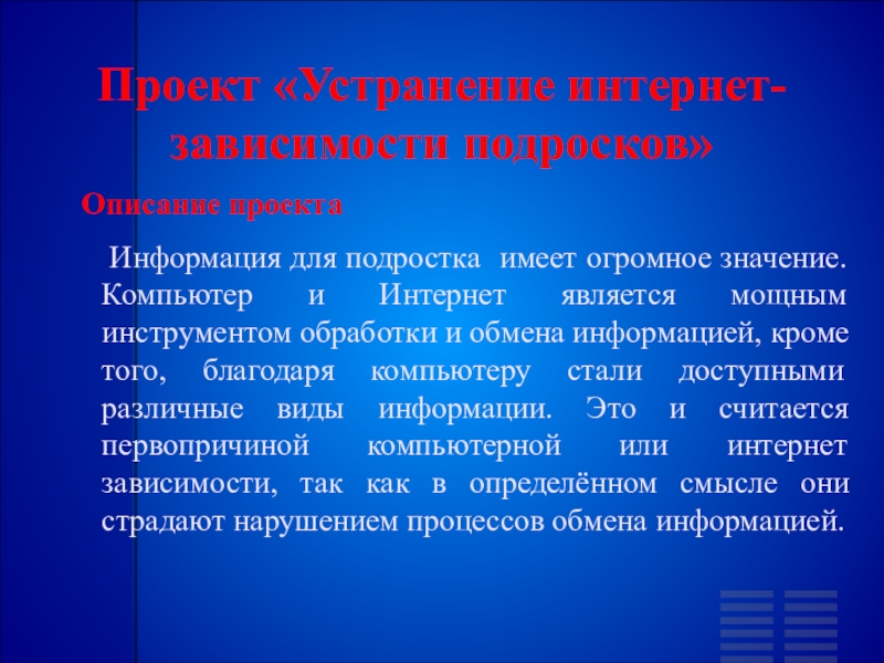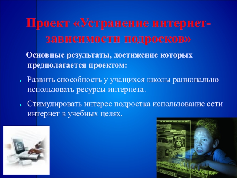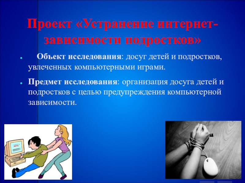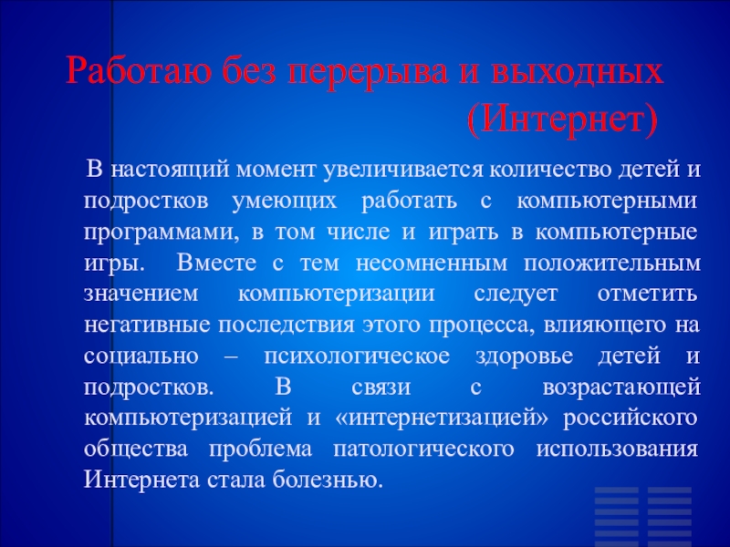 В настоящий момент увеличивается количество детей и подростков умеющих работать с компьютерными программами, в том числе и играть в компьютерные игры. Вместе с тем несомненным положительным значением компьютеризации следует отметить негативные последствия этого процесса, влияющего на социально – психологическое здоровье детей и подростков. В связи с возрастающей компьютеризацией и «интернетизацией» российского общества проблема патологического использования Интернета стала болезнью.