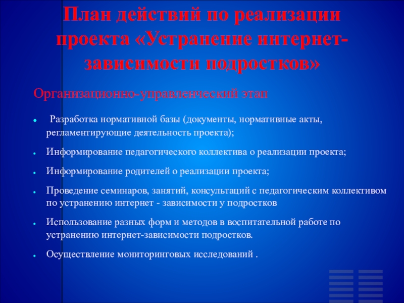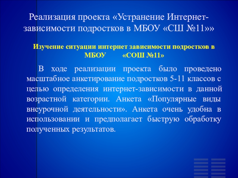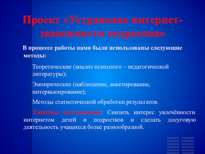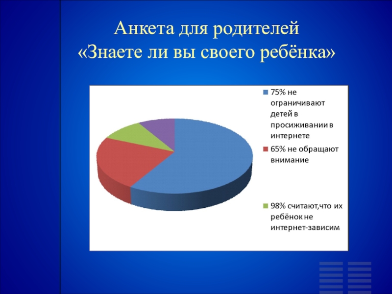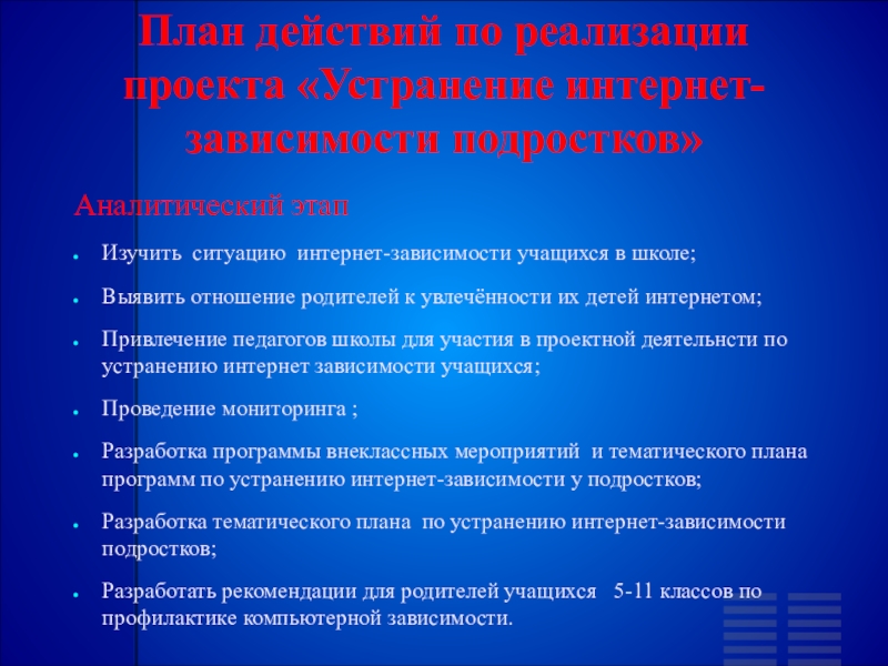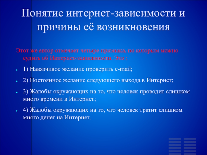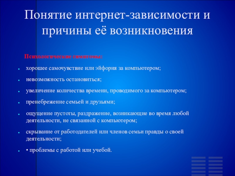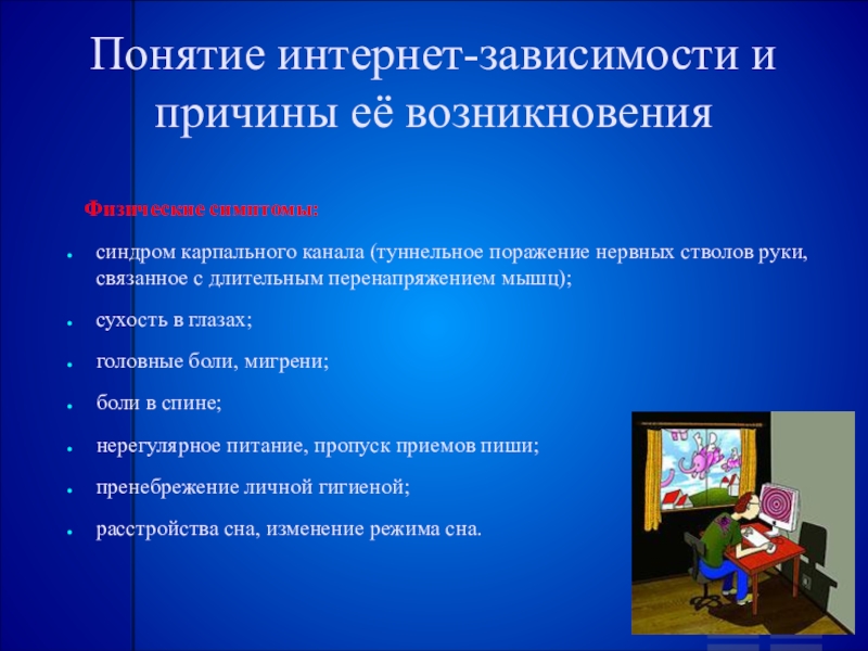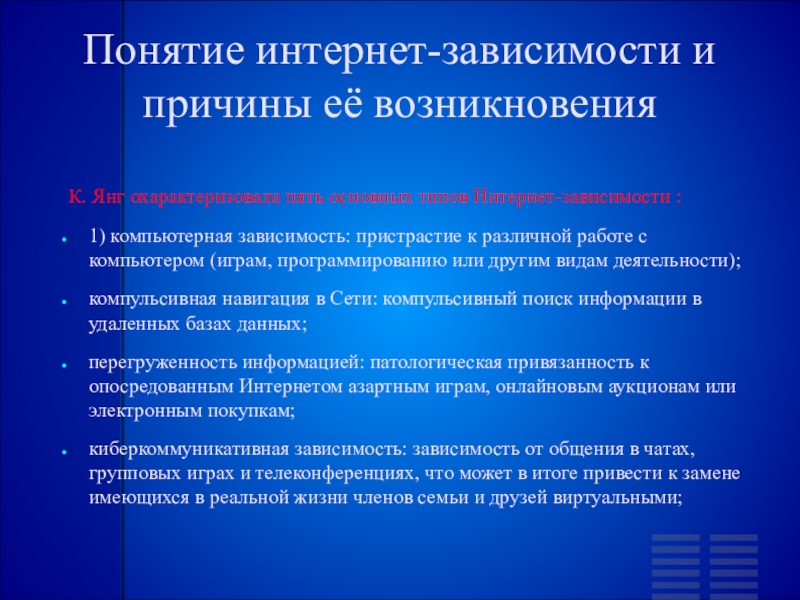 В настоящий момент увеличивается количество детей и подростков умеющих работать с компьютерными программами, в том числе и играть в компьютерные игры. Вместе с тем несомненным положительным значением компьютеризации следует отметить негативные последствия этого процесса, влияющего на социально – психологическое здоровье детей и подростков. В связи с возрастающей компьютеризацией и «интернетизацией» российского общества проблема патологического использования Интернета стала болезнью.