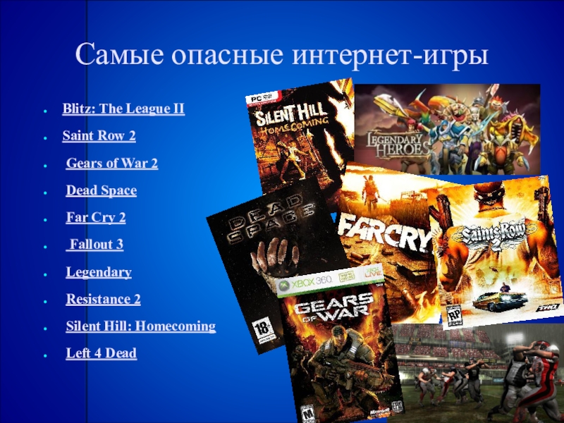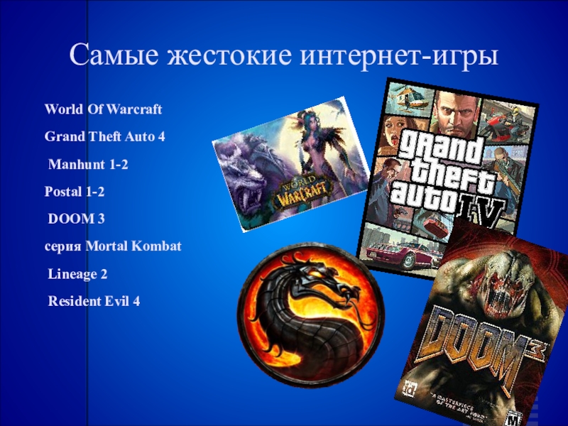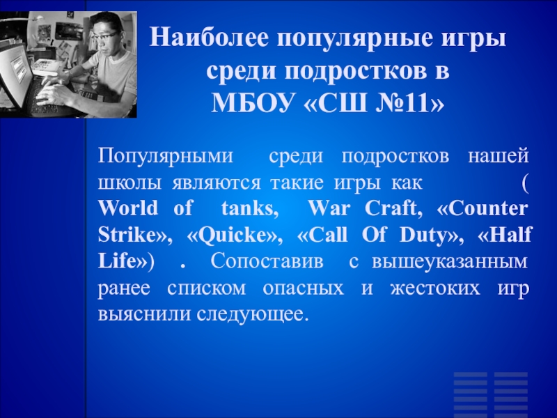 Популярными среди подростков нашей школы являются такие игры как ( World of tanks, War Craft, «Counter Strike», «Quicke», «Call Of Duty», «Half Life») . Сопоставив с вышеуказанным ранее списком опасных и жестоких игр выяснили следующее.